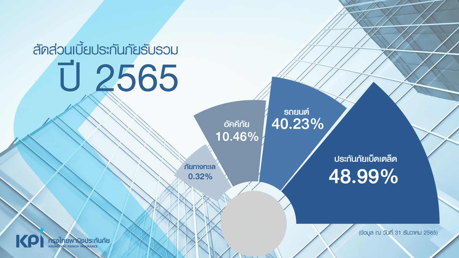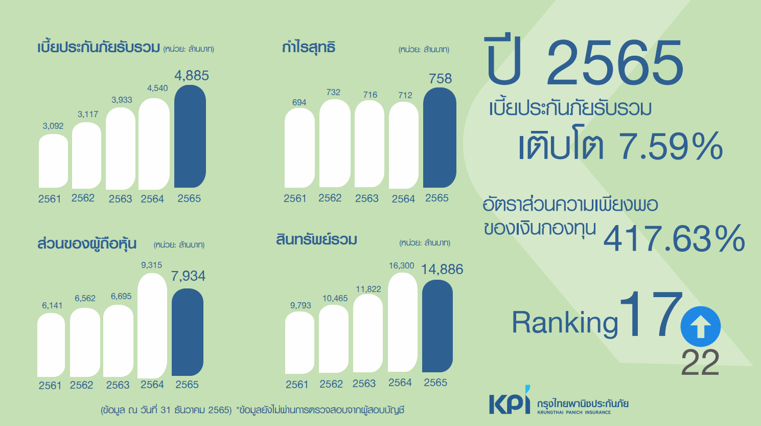 เบี้ยประกันรับรวมที่ 4,885 ล้านบาท เติบโตจากปี 2564 คิดเป็น 7.59% โดยมีสัดส่วนเบี้ยประกันภัยเบ็ดเตล็ด 48.99% ประกันรถยนต์ 40.23% ประกันอัคคีภัย 10.46%  และประกันภัยทางทะเล 0.32% มีกำไรสุทธิที่ 758 ล้านบาท ข้อมูลอ้างอิงสรุป ณ วันที่ 31 ธันวาคม พ.ศ. 2565