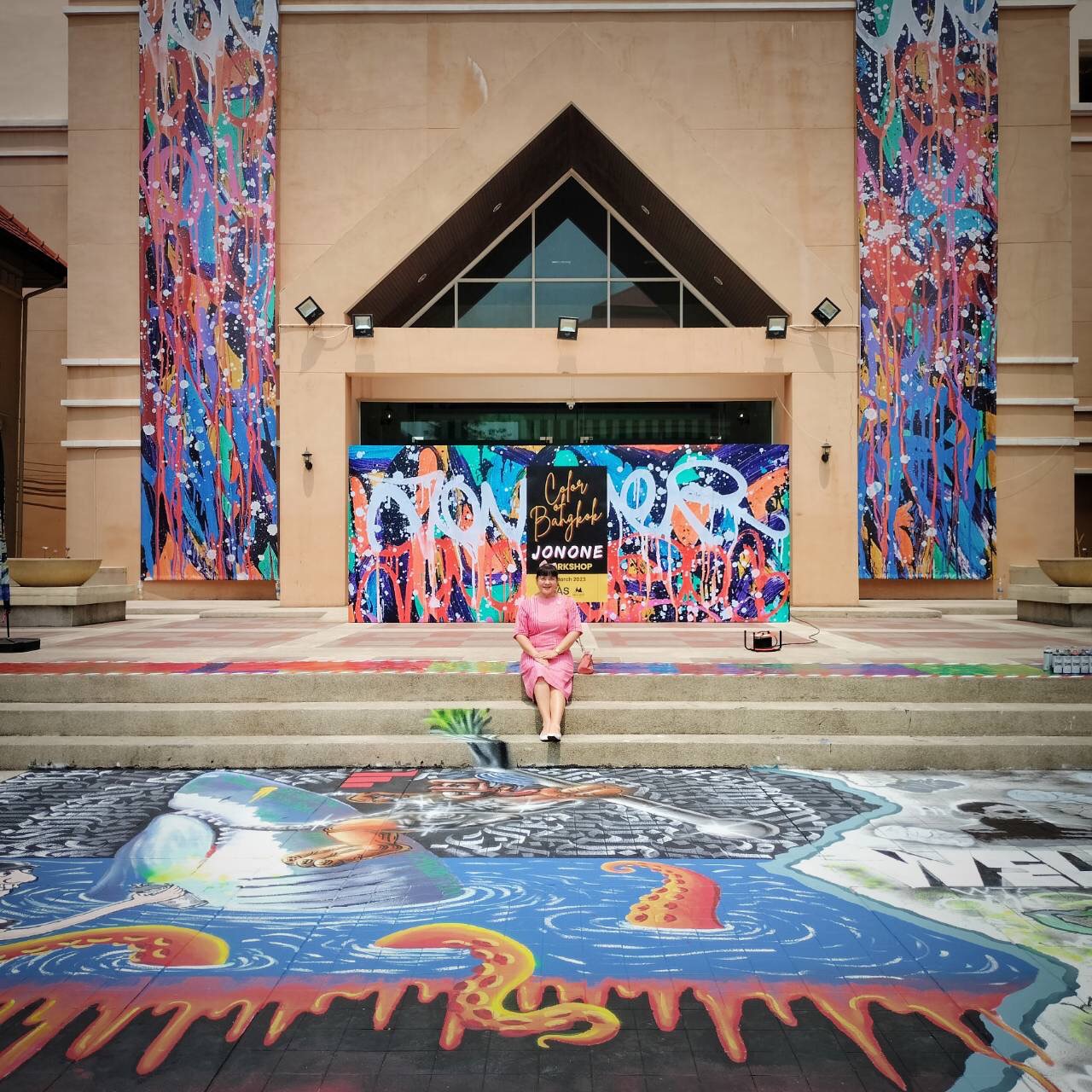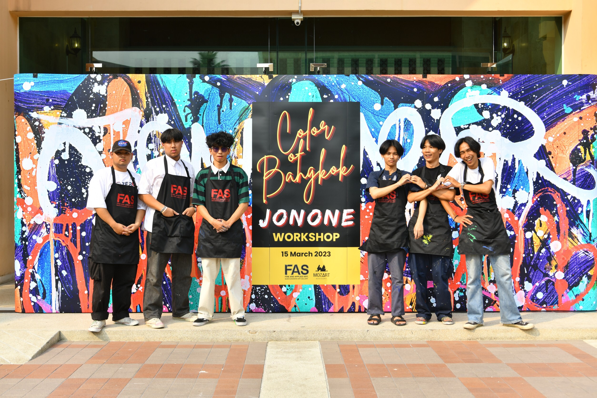สำหรับ John Andrew Perello หรือที่รู้จักในชื่อ JonOne ศิลปินผลงานกราฟฟิตี้ (Graffiti) ระดับโลก ซึ่ง JonOne ได้อธิบายตัวเองว่าเป็น “จิตรกรกราฟฟิตี้แนวแอ็บสแตร็กชั่นนิสต์” ได้รับแรงบันดาลใจจากผลงานระดับปรมาจารย์อย่าง Miró, Kandinsky, Matisse และนักวาดแนวแอ็บสแตรกต์ชาวอเมริกัน เช่น Pollock, Kooning, Joan Mitchell และ Robert Motherwell การระเบิดของสีอย่างแท้จริง โดยในครั้งนี้ซึ่งเป็นที่แรกที่ JonOne ให้เกียรติมาถ่ายทอดผลงานศิลปะผ่านภาพกราฟฟิตี้บนพื้น บริเวณหน้าคณะศิลปกรรมศาสตร์ ซึ่งนับเป็นเรื่องที่น่ายินดีอย่างยิ่งที่ผลงานดังกล่าวจะถูกกล่าวขานและดำเนินภายใต้ประวัติศาสตร์ไปพร้อม ๆ กับงานศิลปะที่จะเกิดขึ้นที่นี่ต่อ ๆ ไปในอนาคต ตลอดจนยังเป็นผลงานเชิงสัญลักษณ์ที่สามารถสะท้อนถึงแรงบันดาลใจและชีวิตของงานศิลปะให้กับศิลปินรุ่นใหม่ต่อไป