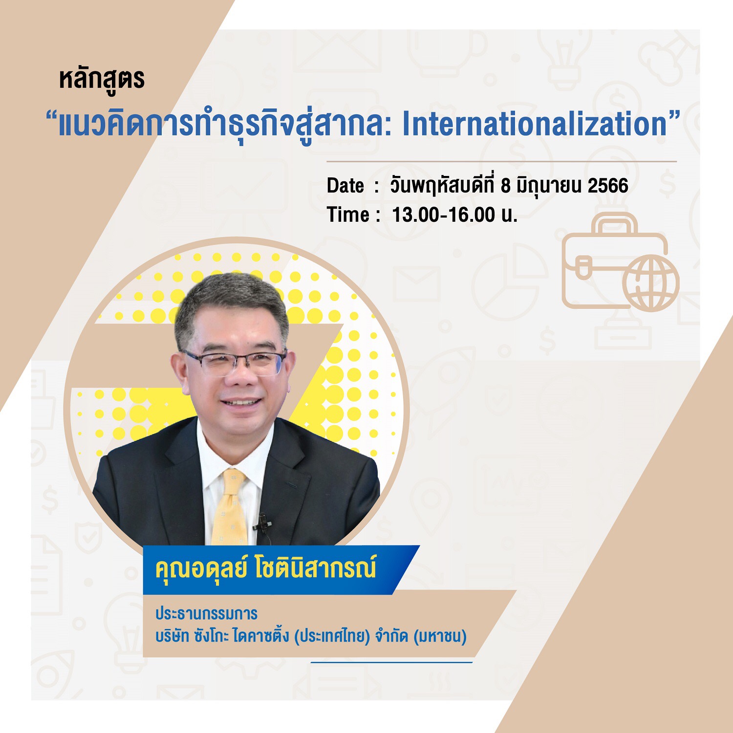 หลักสูตรที่ 6 “แนวคิดการทำธุรกิจสู่สากล: Internationalization” เป็นหลักสูตรใหม่ของปีนี้ จากคำแนะนำจาก คุณปณต บุณยะโหตระ อดีตผู้อำนวยการสำนักงานส่งเสริมการค้าในต่างประเทศ ณ เมืองดูไบ สหรัฐอาหรับเอมิเรตส์ และคุณอดุลย์ โชตินิสากรณ์ ประธานกรรมการ บริษัท ซังโกะ ไดคาซติ้ง (ประเทศไทย) จำกัด (มหาชน) อดีตอธิบดีกรมการค้าต่างประเทศ และอดีตทูตพาณิชย์ในหลากหลายประเทศ ทั้งสองท่านเป็นที่ปรึกษาของโครงการ ซึ่งท่านได้มองเห็นความสำคัญของคำว่า Internationalization เพื่อเชื่อมโยงธุรกิจเข้ากับโลก มองความเป็นสากล มองให้ทันการเปลี่ยนแปลงของโลก การตระหนักถึงพลังของ Soft Power ในการขยายอิทธิพลและส่งผลต่อการเปลี่ยนแปลงพฤติกรรมของผู้บริโภคในปัจจุบัน เรียนรู้ผ่านกรณีศึกษาต่างๆ เพื่อเตรียมความพร้อมสู่โอกาสการเปิดธุรกิจในต่างประเทศ จึงถือได้ว่าเป็นหลักสูตรที่จะจุดประกายความคิดให้ผู้เรียน ให้สามารถต่อยอดธุรกิจของตนเองในอนาคตต่อไปนั่นเองค่ะ