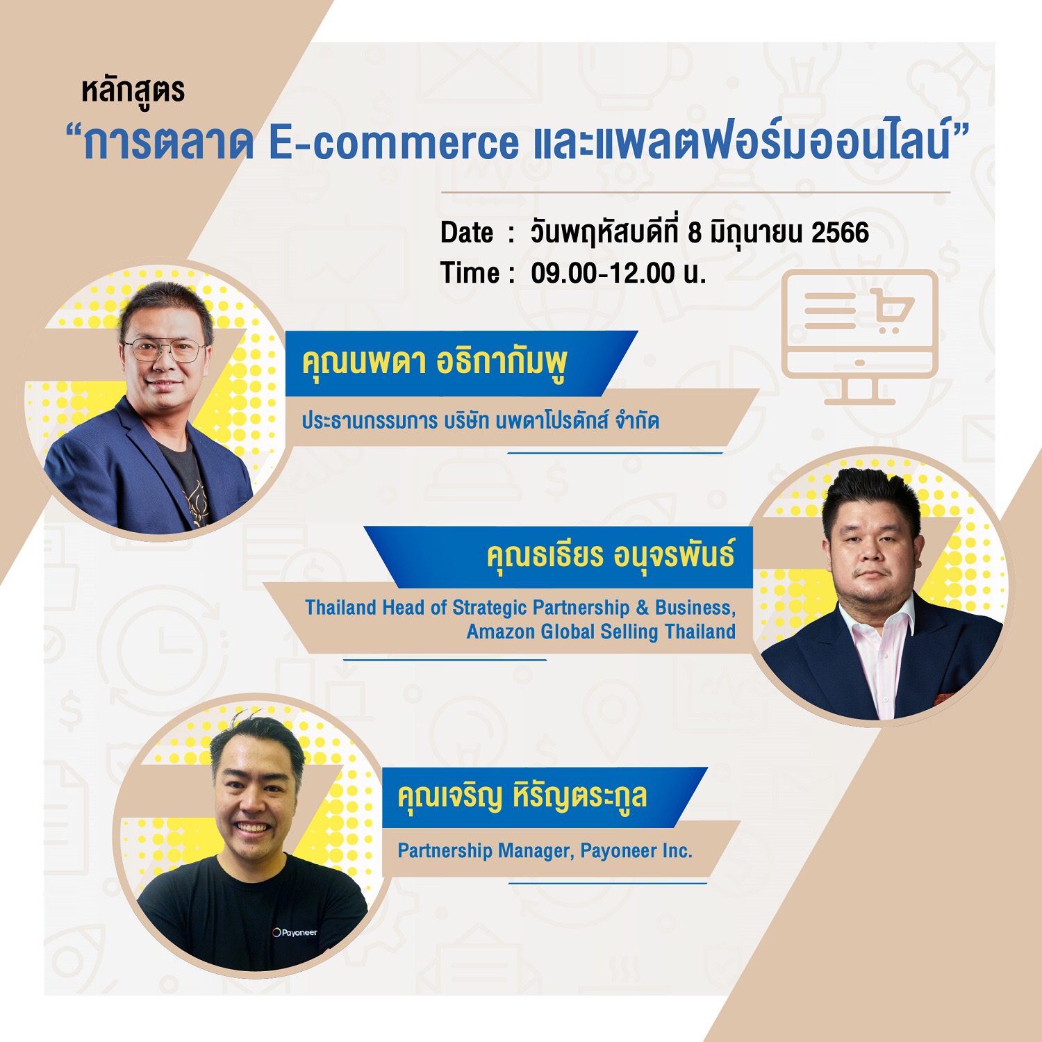 ในหลักสูตรที่ 5 “การตลาด E-commerce และแพลตฟอร์มออนไลน์” บรรยายโดยวิทยากร 3 ท่าน ได้แก่ คุณนพดา อธิกากัมพู เจ้าของธุรกิจกระเทียมดำภายใต้แบรนด์ B-Garlic มีประสบการณ์ด้านการใช้ประโยชน์จากแพลตฟอร์มออนไลน์ในการขยายตลาดในประเทศและต่างประเทศ และได้รับรางวัล PM Export Award 2021 คนที่ 2 คุณธเธียร อนุจรพันธ์ Head of Strategic Partnership & Business of Amazon Global Selling Thailand หนึ่งในหน่วยธุรกิจของ Amazon ซึ่งจัดตั้งขึ้นเพื่อมุ่งสนับสนุนให้ผู้ประกอบการทั่วโลกขยายฐานการค้าสู่ตลาดต่างประเทศ ผ่านการสร้างแบรนด์เพื่อยกระดับสู่สากล และการเข้าถึงลูกค้าที่ซื้อสินค้าบนมาร์เก็ตเพลสของ Amazon ทั่วโลก และคุณเจริญ หิรัญตระกูล Partnership Manager, Payoneer Inc. ผู้ที่มีความเชี่ยวชาญในการจัดหาโซลูชั่นสำหรับธุรกิจ B2B และอุตสาหกรรมอีคอมเมิร์ซผ่านแพลตฟอร์มการชำระเงินระดับโลกที่เชื่อถือได้ ซึ่งเป็นหลักสูตรที่นำประสบการณ์ตรงของผู้ส่งออกตัวจริงมาถ่ายทอดเป็น case study ให้ผู้เรียนได้เห็นภาพตั้งแต่เรื่องการส่งออก จนถึงแนะนำแพลตฟอร์มออนไลน์ ที่สามารถทำให้การส่งออกง่ายและสะดวกมากยิ่งขึ้น