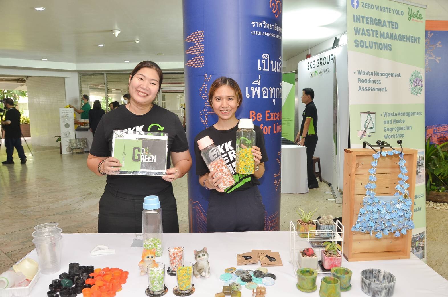 สำหรับ ๔ องค์กรรับจัดการขยะพลาสติก ได้นำผลิตภัณฑ์ที่แปรรูปจากขยะพลาสติก มาแสดงในงาน ไม่ว่าจะเป็นกระเป๋าแฟชั่น กระถางต้นไม้ จานรองแก้ว รวมถึงบอร์ดแสดงขั้นตอน การจัดการขยะและร่วมเสวนา “จับมือกันผลักดันให้โลกสวยงาม” ร่วมกับผู้บริหารจากองค์การ บริหารจัดการก๊าซเรือนกระจก (องค์การมหาชน) เพื่อสร้างความเข้าใจแนวทางบริหารจัดการขยะ พลาสติกในชุมชน เทียบเท่ากับการปลูกต้นไม้จำนวน ๕๘๒.๒๓ ต้น