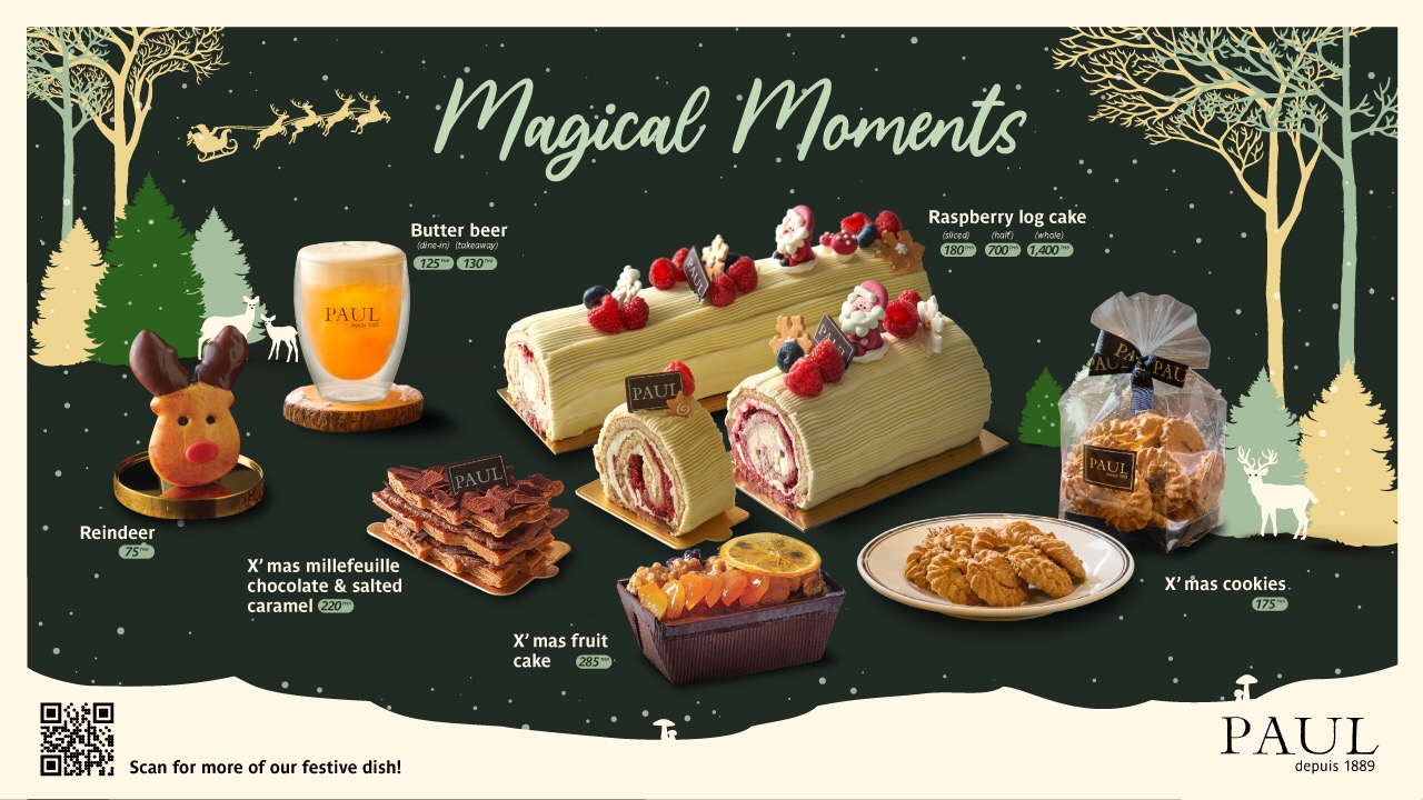 ยังมีขนมที่นิยมในช่วงเทศกาลคริสต์มาส และปีใหม่ พร้อมเสิร์ฟอย่าง X’mas millefeuille ขนมหวานสัญชาติฝรั่งเศส เป็นขนมที่มีหลายชั้นซ้อนกันระหว่างครีม ตกแต่งด้วยแป้งพายบางกรอบทรงต้นคริสต์มาสแสนน่ารักทั้ง chocolate & salted caramel mille และ X’mas millefeuille strawberry รวมถึง X’mas fruit cake, X’mas chocolate mousse cake และ X’mas cookies ปิดท้ายด้วย Butter Beer เครื่องดื่มโซดาผสมกับไซรัปบัทเทอร์สก็อต และคาราเมลซอส ท็อปด้วย Signature cream cheese จาก Paul เนื้อเนียนนุ่ม รสชาติหวานหอม สดชื่น เหมาะกับทานในช่วงเทศกาลแห่งการเฉลิมฉลองเป็นอย่างยิ่ง